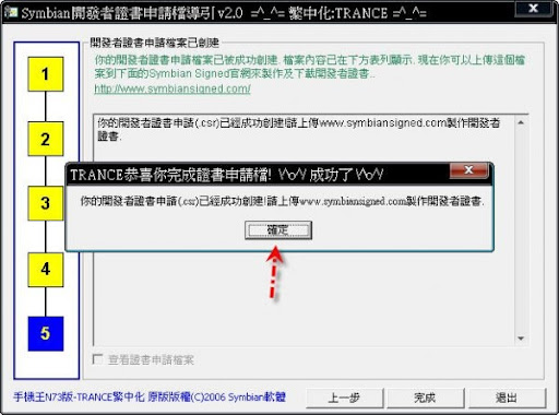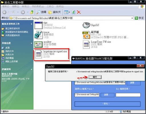 5-3~按簽名後,會出現"檔案已簽名並儲存到:"(註:原檔在那裡~就儲存在那裡),然後按確定!此時你會看到會多出一個軟體,那個就是已簽證好的軟體,可以直接安裝在手機裡!