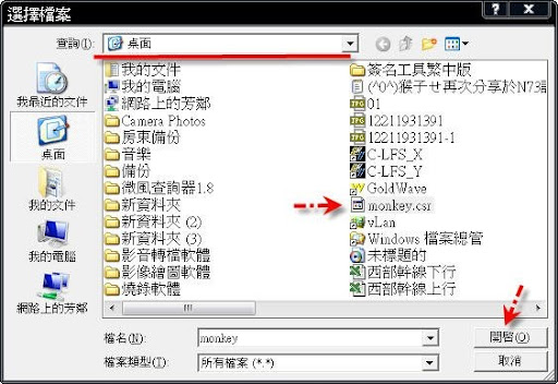 3-2~上面箭頭處,位置請選擇桌面,因為這樣等等會比較好找!下面箭頭處~檔案名稱,可隨便打!但是後面一定要加.csr,再按開啟