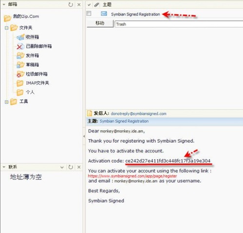 2-3~收到來自Symbian的信!下面的箭頭處,紅線那一行請選取複製或抄下來!等等會用到!(註:若無收到信件,可能Symbian網站傳輸比較慢,須要等幾分鐘才會收到信!可先進行2-4部分)